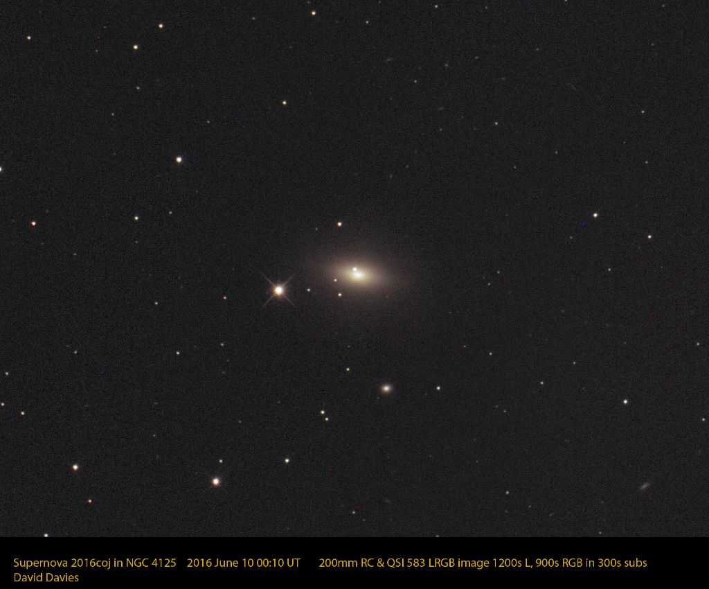 I read that this supernova has taken place in NGC 4125, a very elongated elliptical galaxy of type E6, which is located about 70 million light years away and is approximately magnitude 10 in the constellation Draco, just above the ring of the Big Dipper. The supernova itself is a type 1a and is around magnitude 14. You can see it in this image just above the galactic centre.