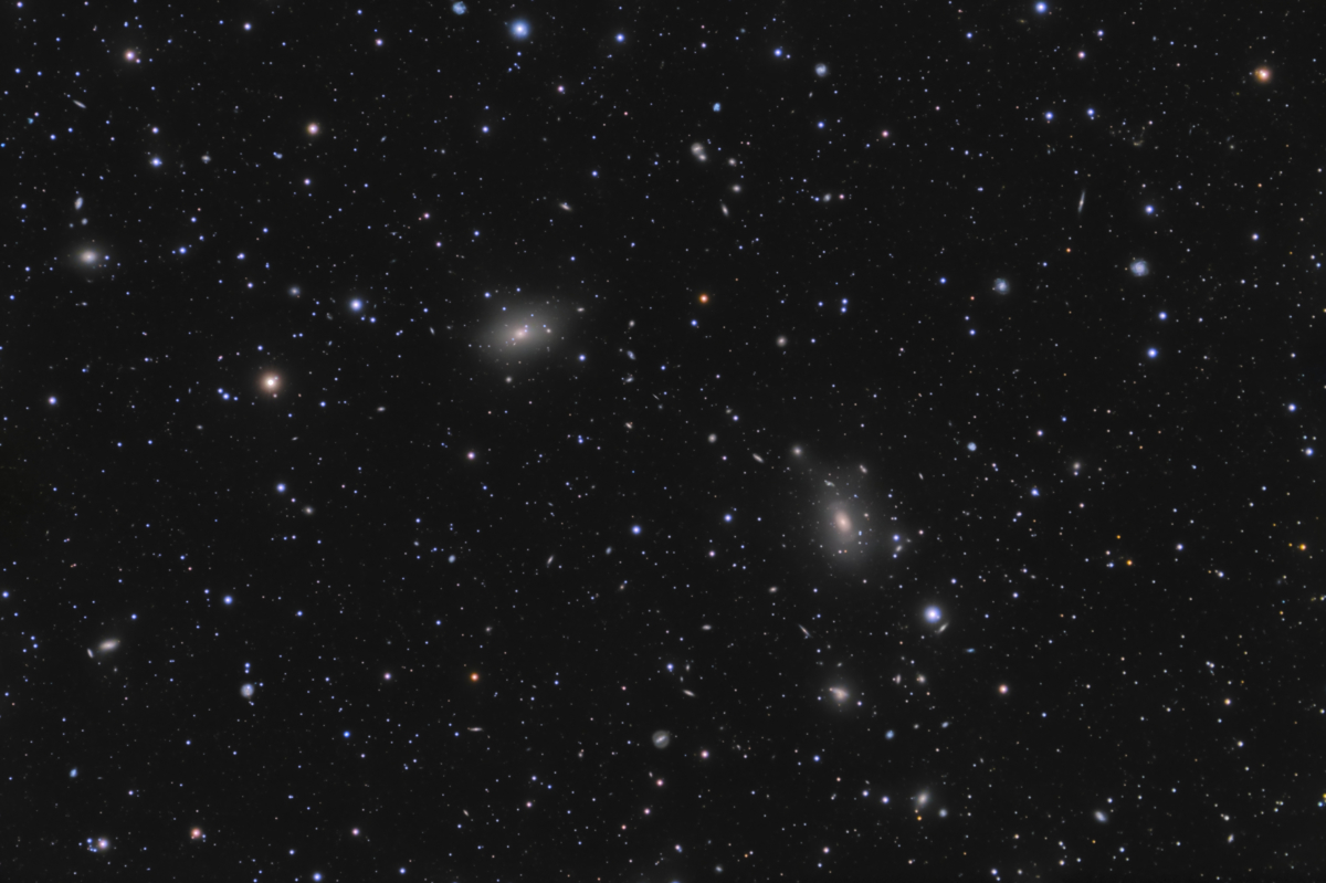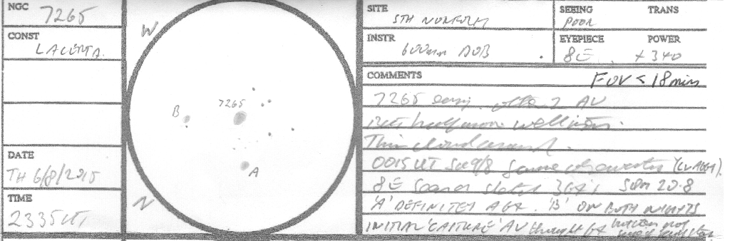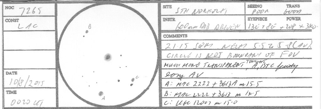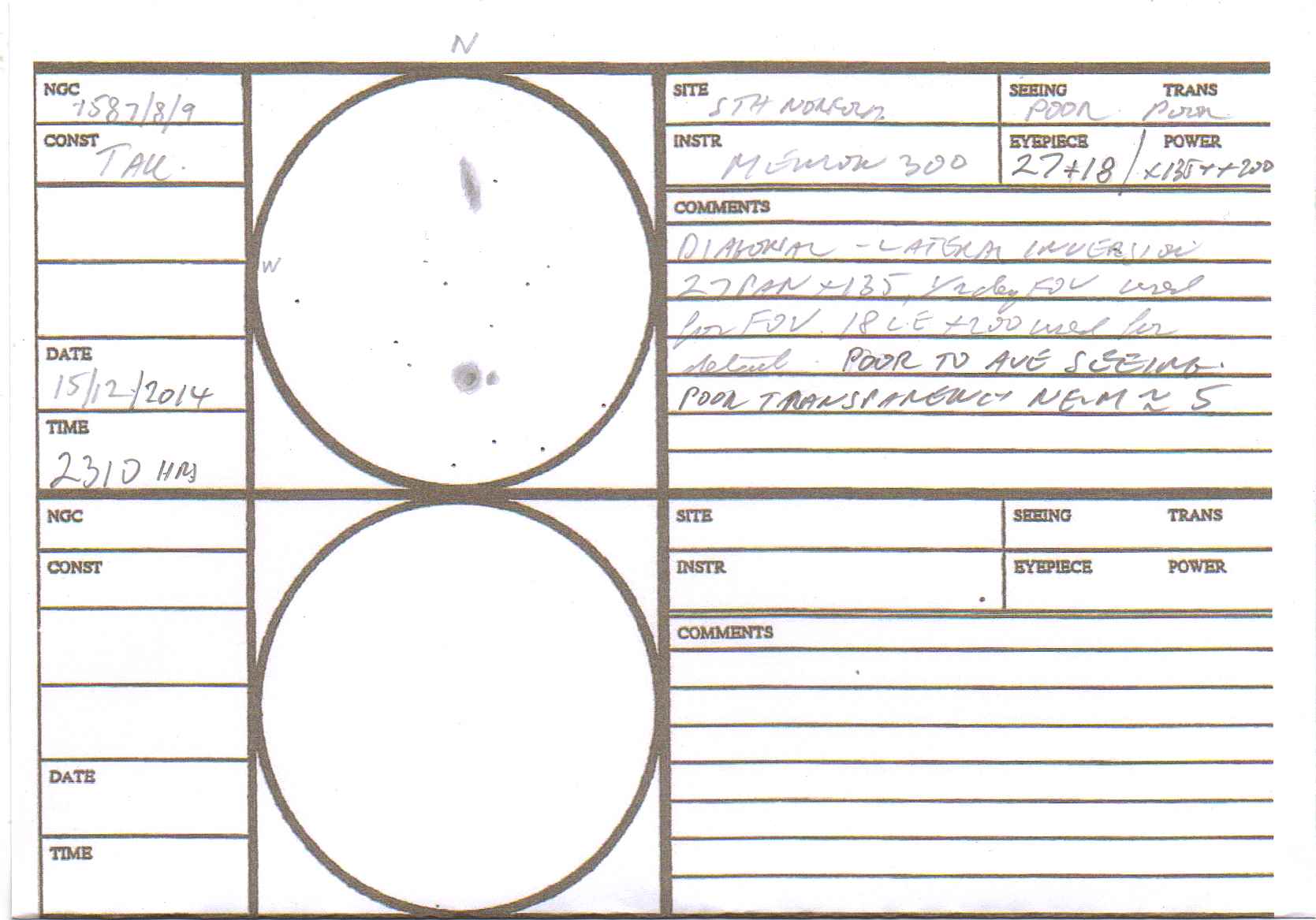AV/2, very close to a star on it's NP edge which tends to "wash out" this galaxy. It is small, round, diffuse, even brightness throughout.